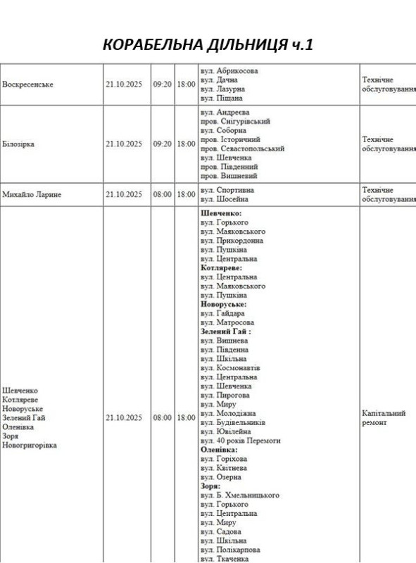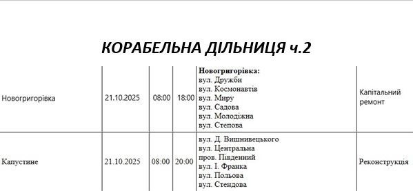 Графік відключення світла по адресах на 21 жовтня, Корабельна дільниця АТ «Миколаївобленерго»