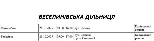 Графік відключення світла по адресах на 21 жовтня, Веселинівська дільниця АТ «Миколаївобленерго»