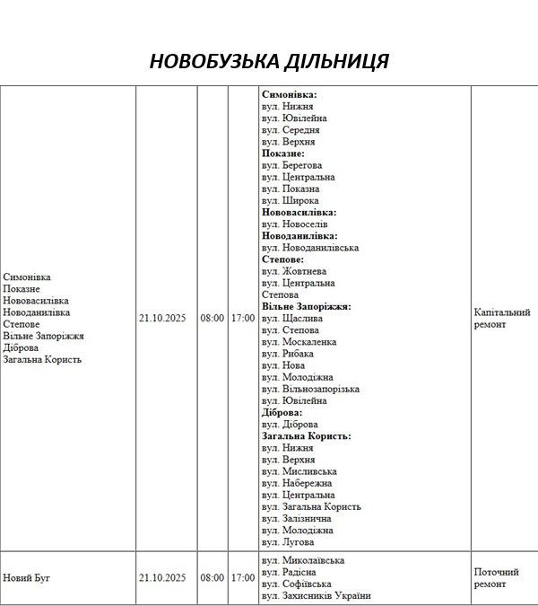 Графік відключення світла по адресах на 21 жовтня, Новобузька дільниця АТ «Миколаївобленерго»