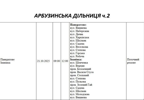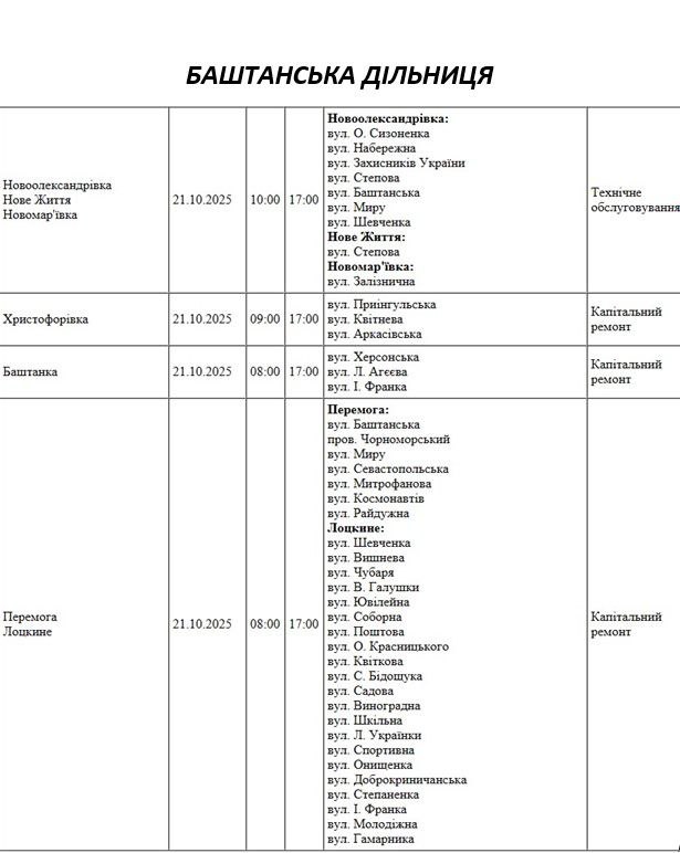 Графік відключення світла по адресах на 21 жовтня, Баштанська дільниця АТ «Миколаївобленерго»