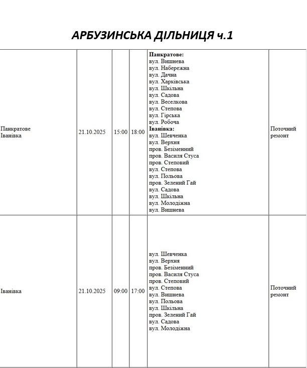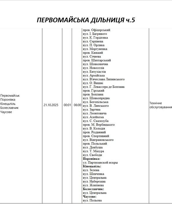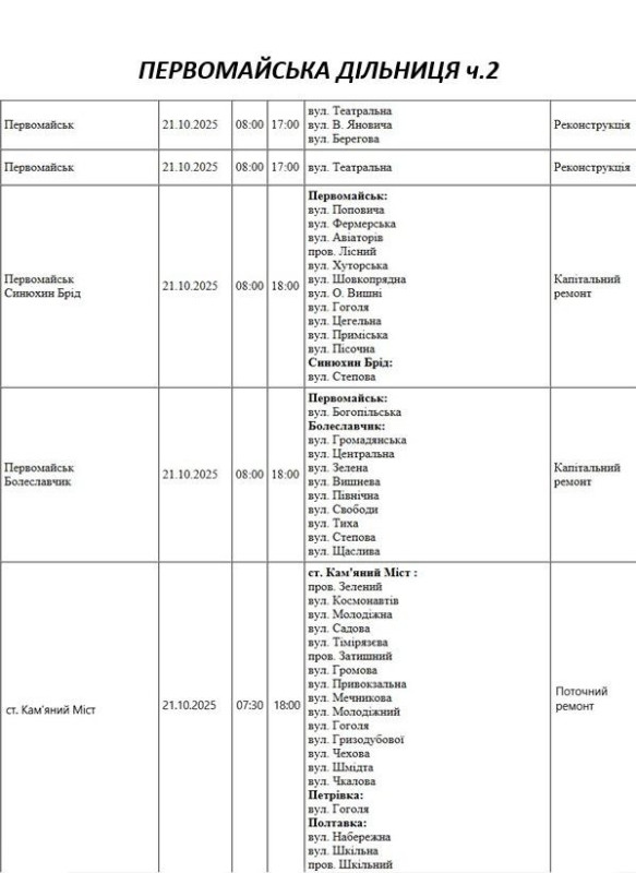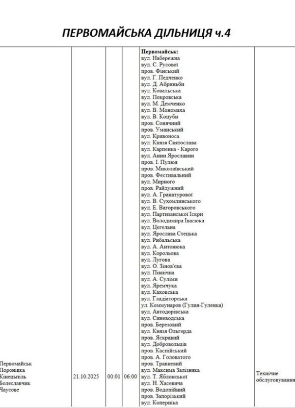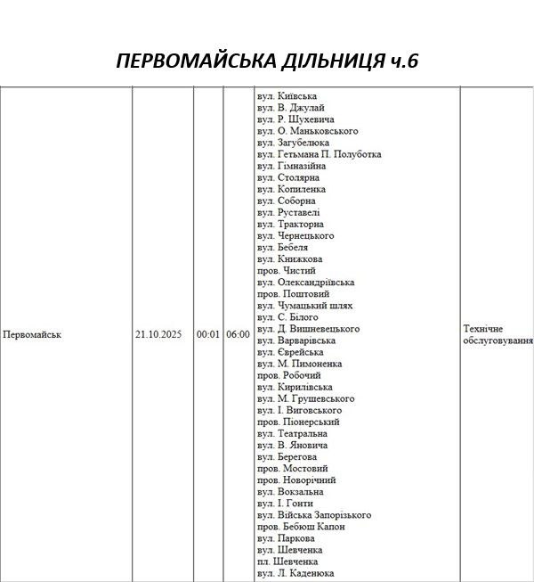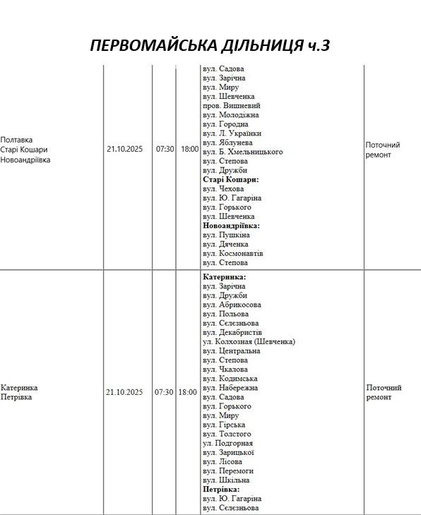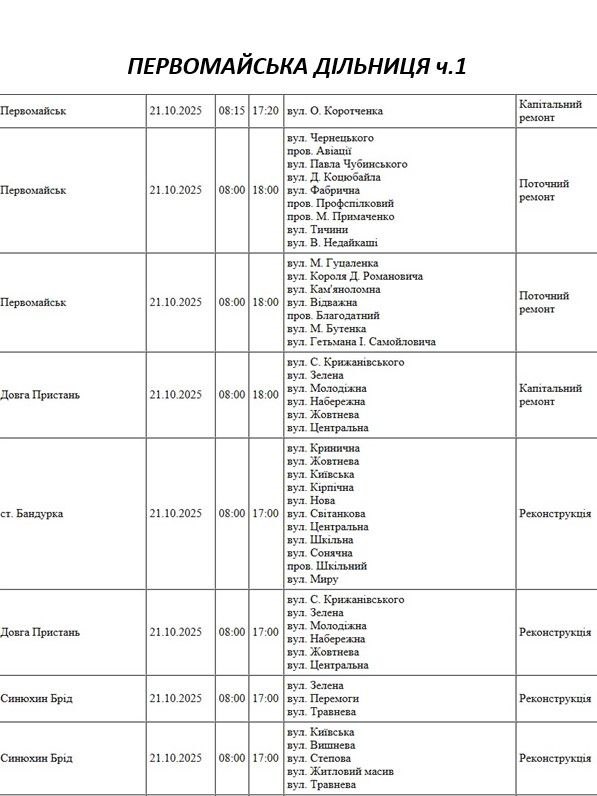 Графік відключення світла по адресах на 21 жовтня, Первомайська дільниця АТ «Миколаївобленерго»