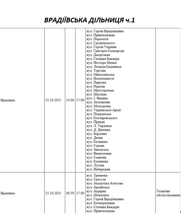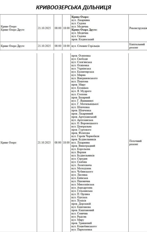 Графік відключення світла по адресах на 21 жовтня, Кривоозерська дільниця АТ «Миколаївобленерго»