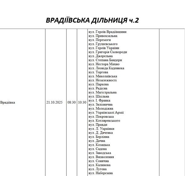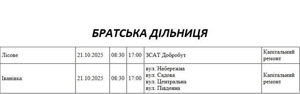 Графік відключення світла по адресах на 21 жовтня, Братська дільниця АТ «Миколаївобленерго»