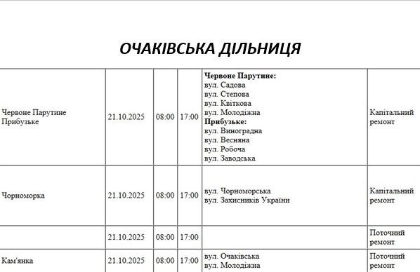 Графік відключення світла по адресах на 21 жовтня, Очаківська дільниця АТ «Миколаївобленерго»