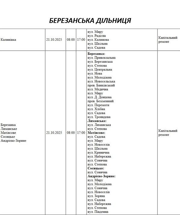 Графік відключення світла по адресах на 21 жовтня, Березанська дільниця АТ «Миколаївобленерго»