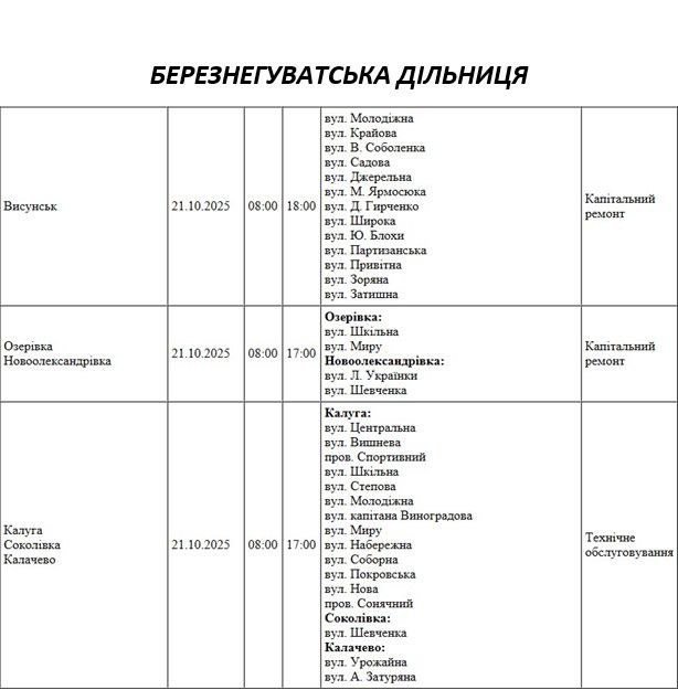 Графік відключення світла по адресах на 21 жовтня, Березенгуватська дільниця АТ «Миколаївобленерго»