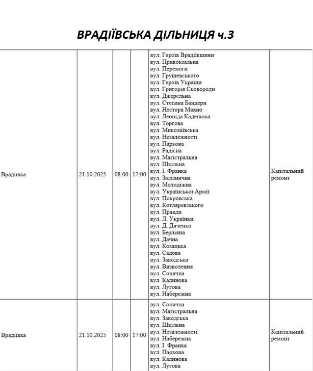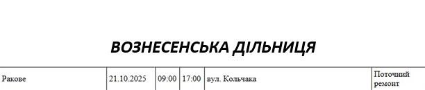 Графік відключення світла по адресах на 21 жовтня, Вознесенська дільниця АТ «Миколаївобленерго»