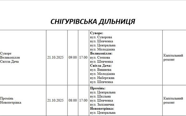 Графік відключення світла по адресах на 21 жовтня, Снігурівська дільниця АТ «Миколаївобленерго»