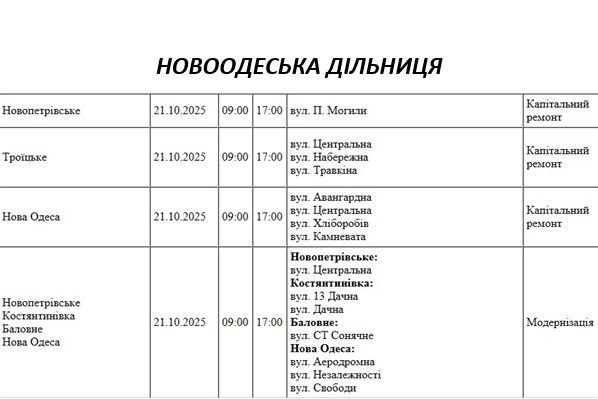 Графік відключення світла по адресах на 21 жовтня, Нооводеська дільниця АТ «Миколаївобленерго»