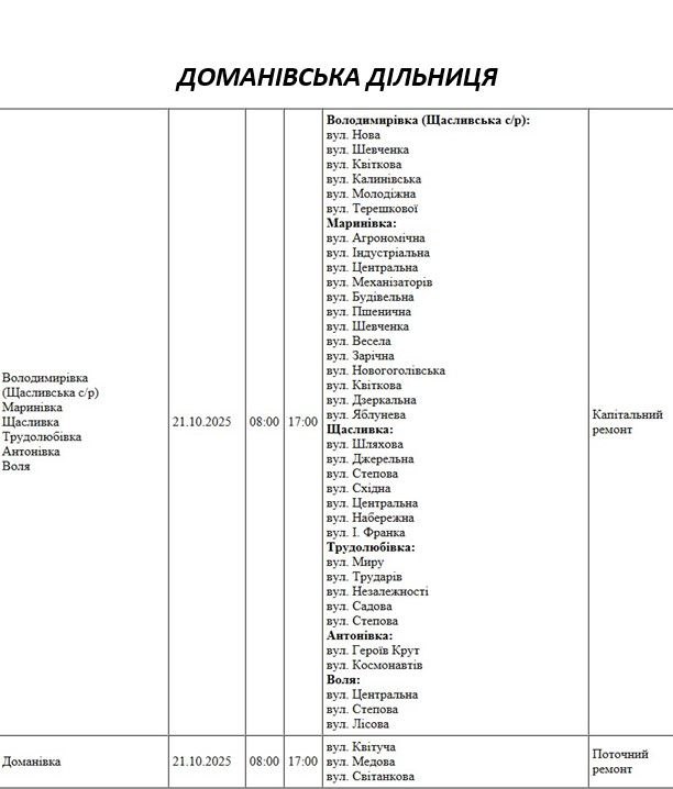 Графік відключення світла по адресах на 21 жовтня, Доманівська дільниця АТ «Миколаївобленерго»