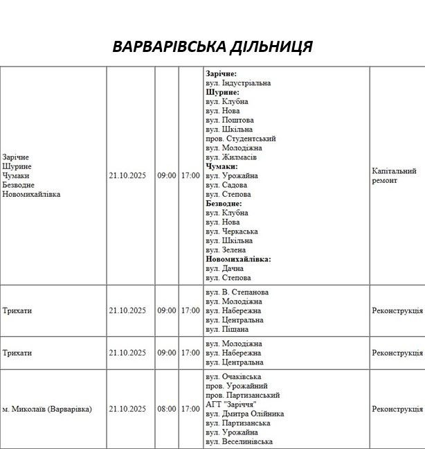 Графік відключення світла по адресах на 21 жовтня, Варварівська дільниця АТ «Миколаївобленерго»