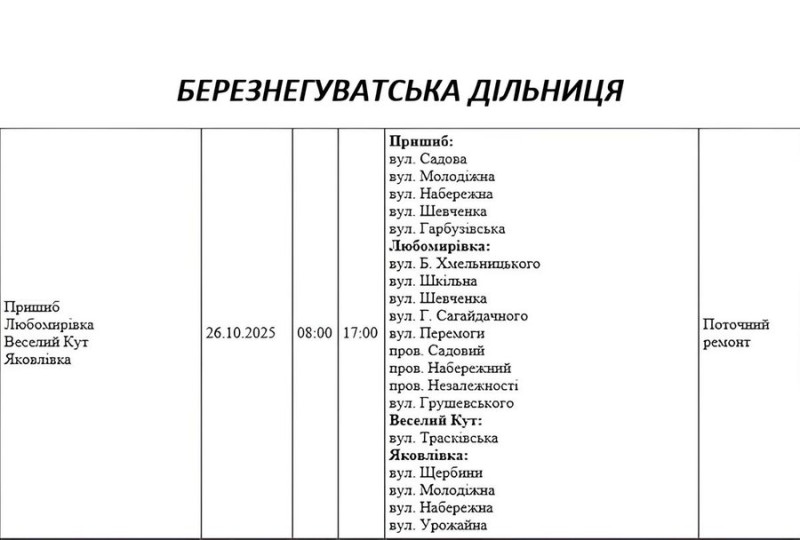 Графік відключення світла по адресах на 26 жовтня, Березенгуватська дільниця. АТ «Миколаївобленерго»