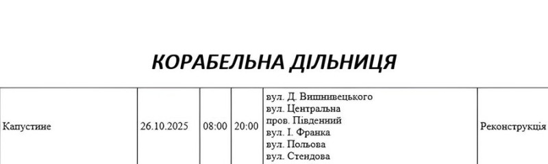 Графік відключення світла по адресах на 26 жовтня, Корабельна дільниця. АТ «Миколаївобленерго»