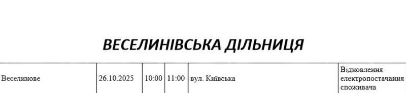 Графік відключення світла по адресах на 26 жовтня, Веселинівська дільниця. АТ «Миколаївобленерго»