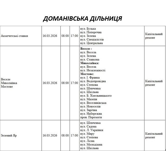 Графік відключення світла по адресах 16 березня, Доманівська дільниця. АТ «Миколаївобленерго»