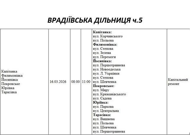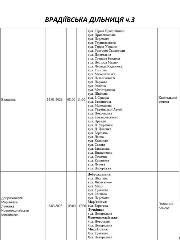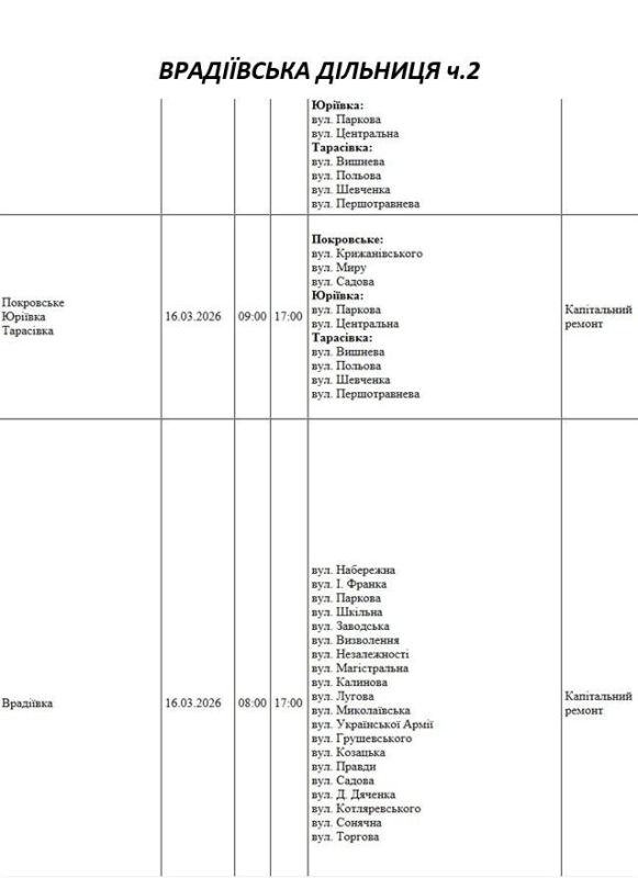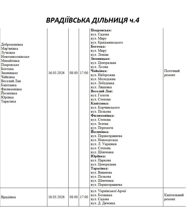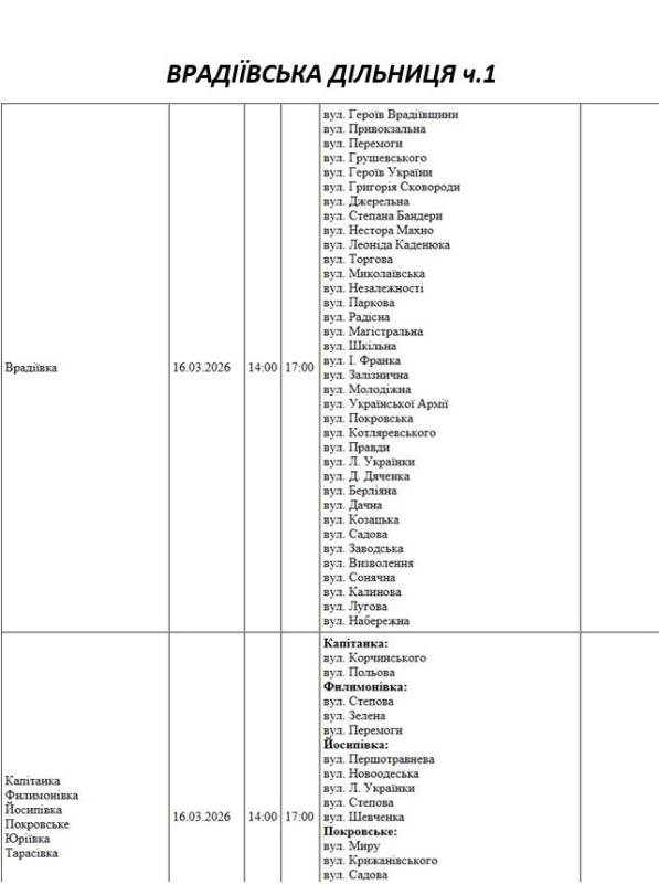 Графік відключення світла по адресах 16 березня, Врадіївська дільниця. АТ «Миколаївобленерго»