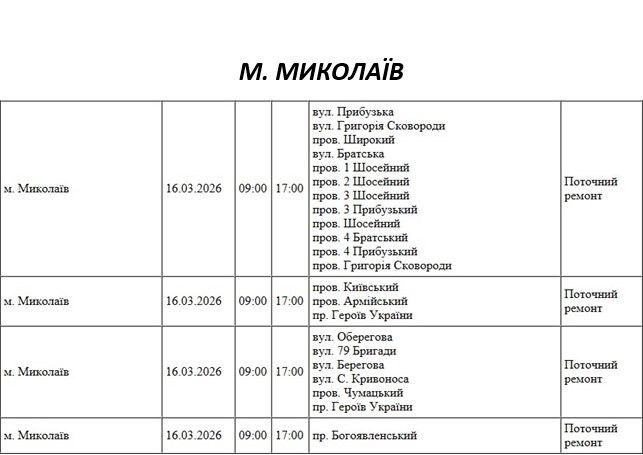 Графік відключення світла по адресах 16 березня, Миколаїв. АТ «Миколаївобленерго»