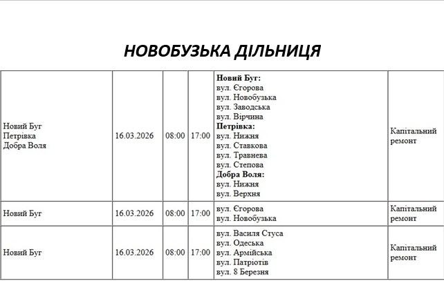 Графік відключення світла по адресах 16 березня, Новобузька дільниця. АТ «Миколаївобленерго»