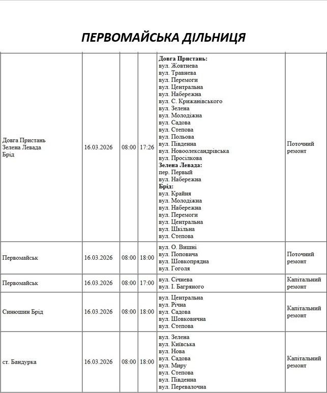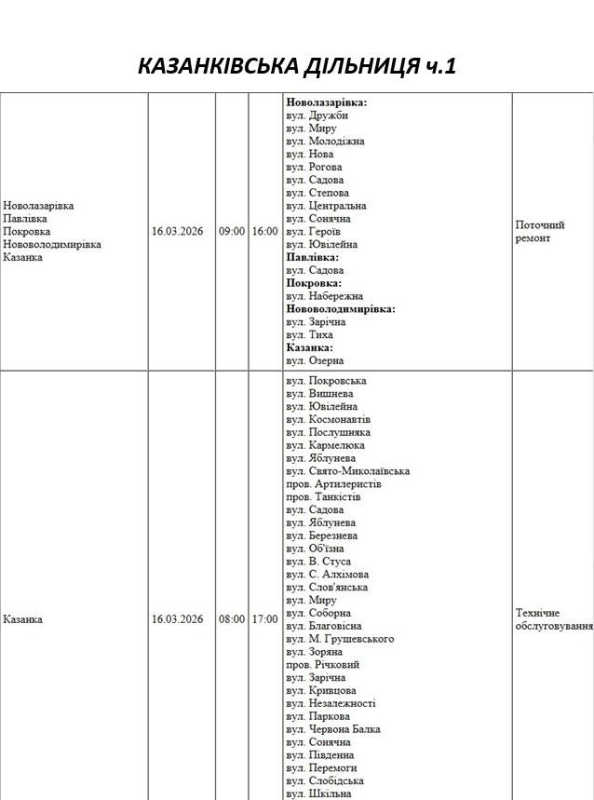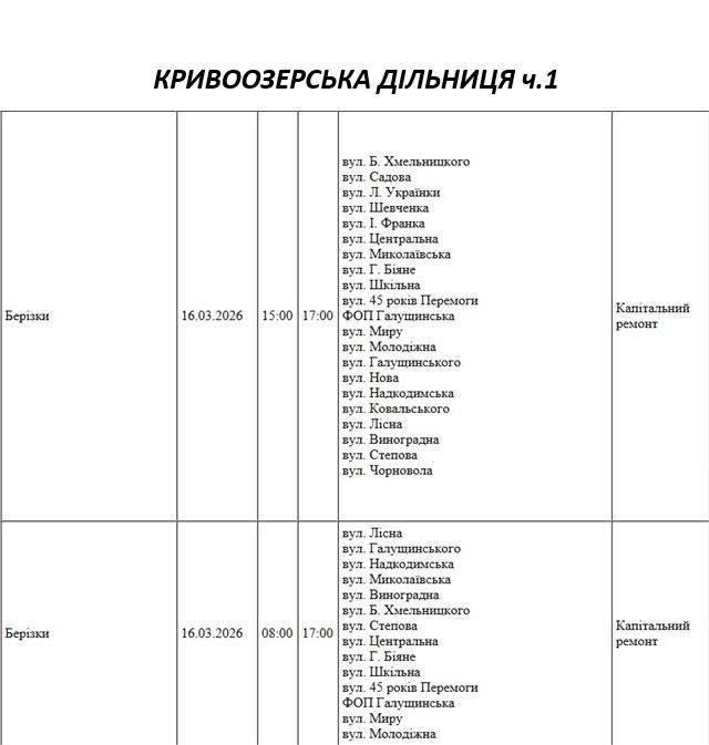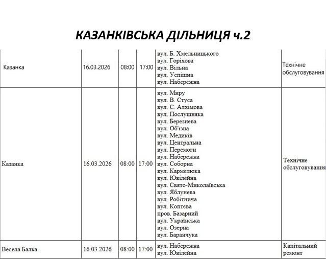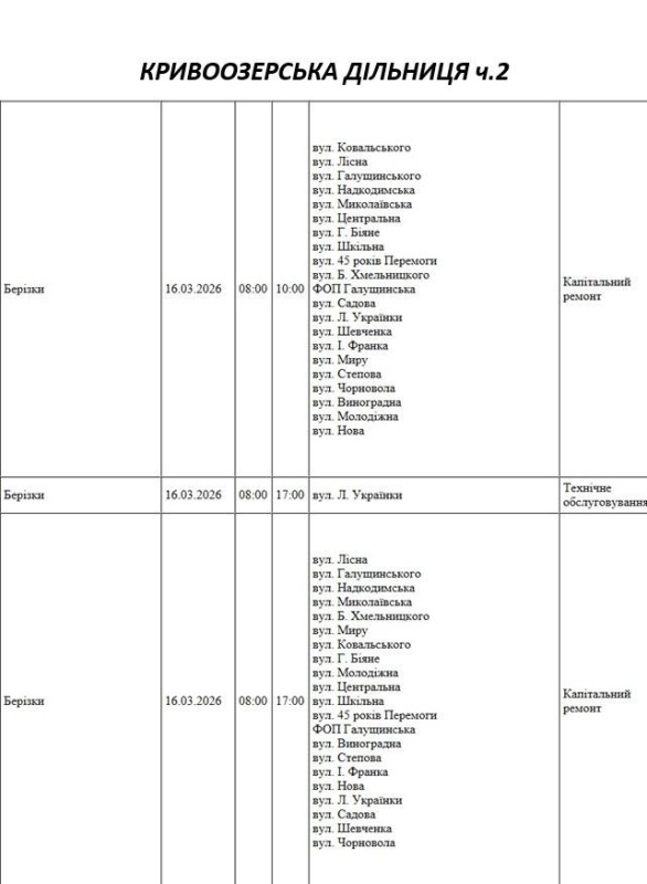 Графік відключення світла по адресах 16 березня, Кривоозерська дільниця. АТ «Миколаївобленерго»