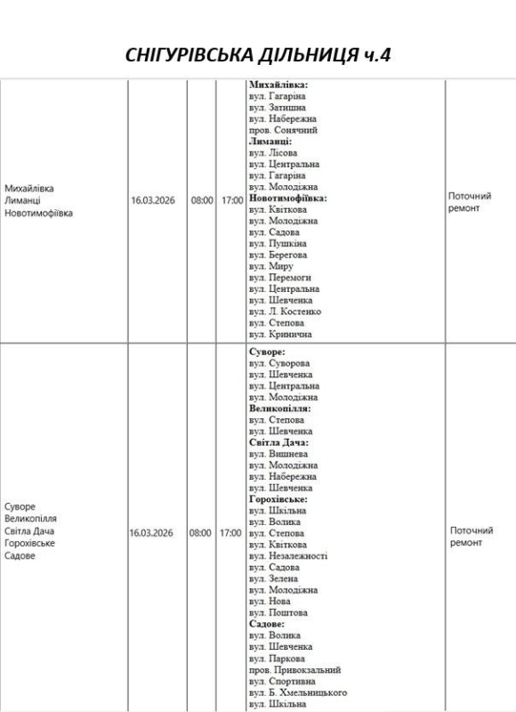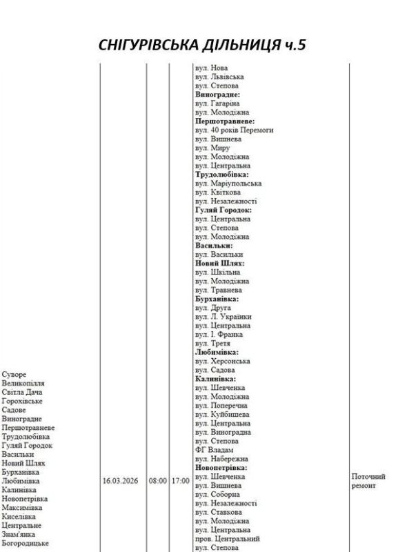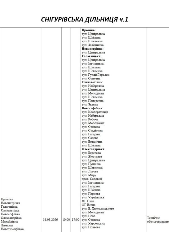Графік відключення світла по адресах 16 березня, Снігурівська дільниця. АТ «Миколаївобленерго»