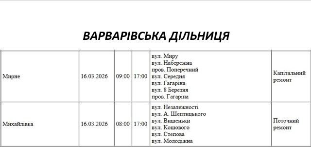 Графік відключення світла по адресах 16 березня, Варварівська дільниця. АТ «Миколаївобленерго»