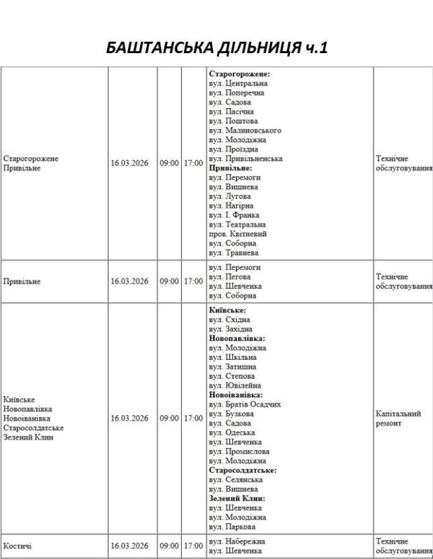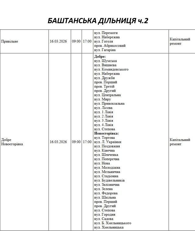 Графік відключення світла по адресах 16 березня, Баштанська дільниця. АТ «Миколаївобленерго»