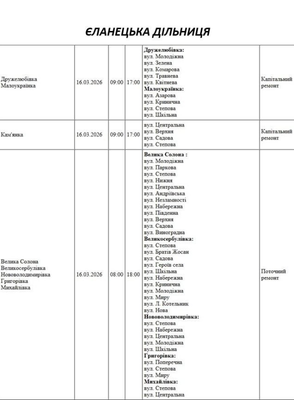 Графік відключення світла по адресах 16 березня, Єланецька дільниця. АТ «Миколаївобленерго»