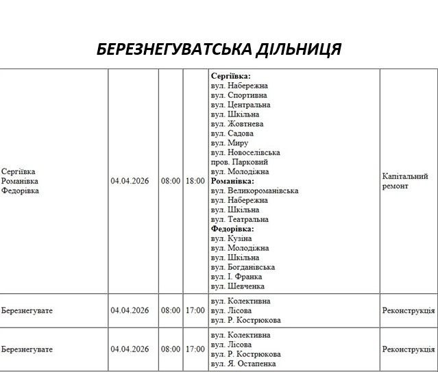 Графік відключення світла по адресах 4 квітня, Березнегуватсяка дільниця АТ «Миколаївобленерго»