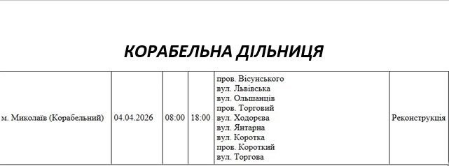 Графік відключення світла по адресах 4 квітня, Корабельна дільниця АТ «Миколаївобленерго»