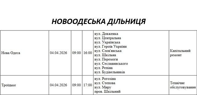 Графік відключення світла по адресах 4 квітня, Новоодеська дільниця АТ «Миколаївобленерго»