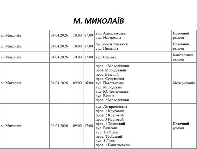 Графік відключення світла по адресах 4 квітня, Миколаївська дільниця АТ «Миколаївобленерго»