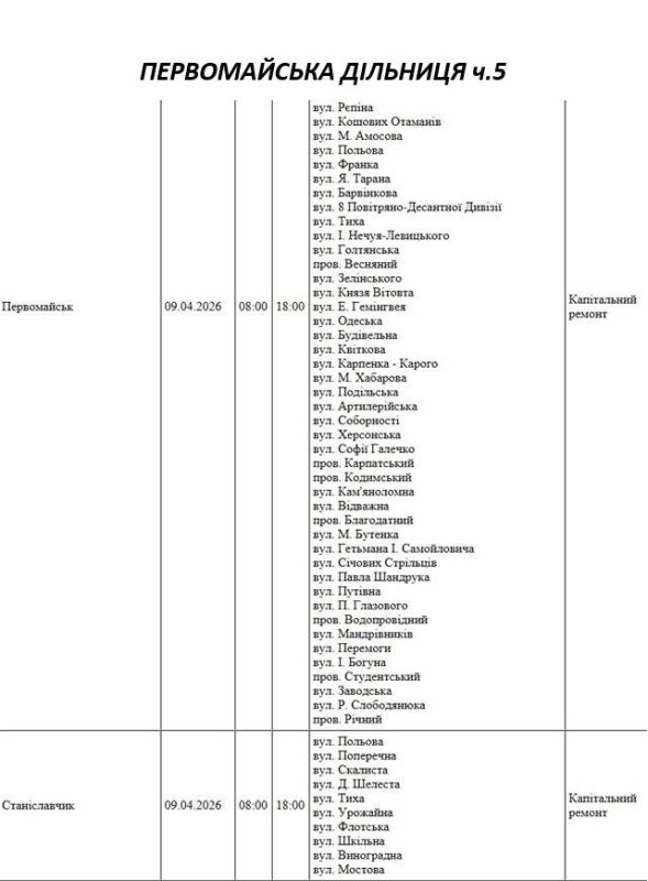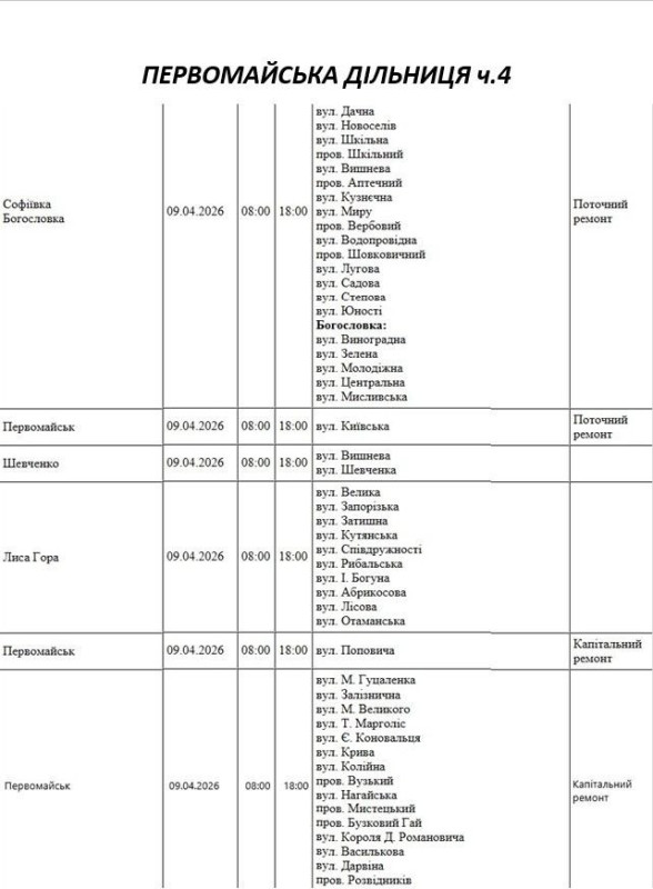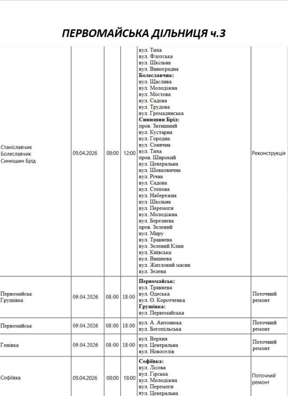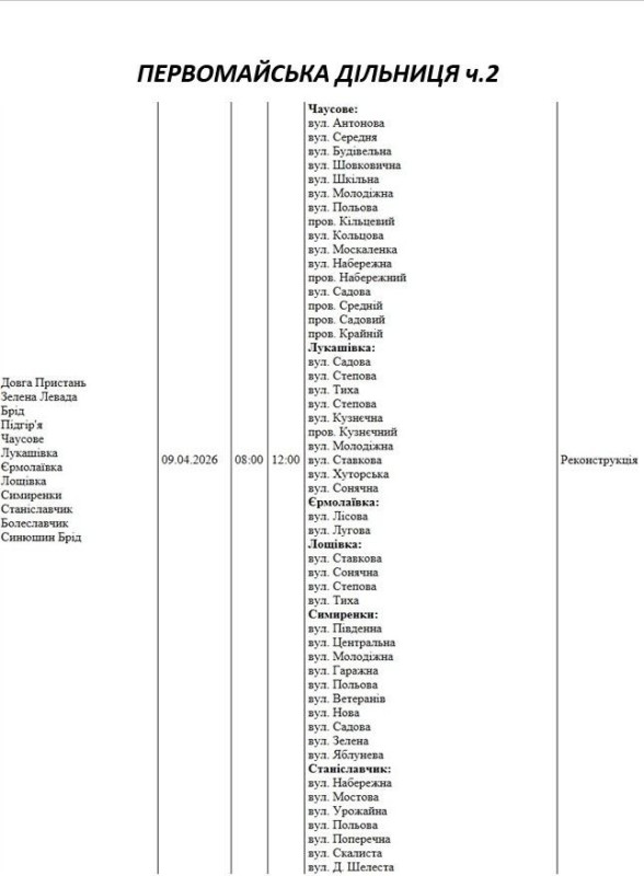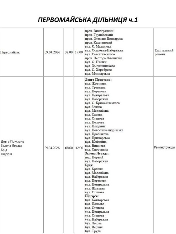 Графік відключення світла по адресах 9 квітня, Первомайська дільниця АТ «Миколаївобленерго»