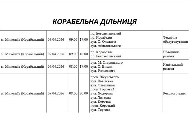 Графік відключення світла по адресах 9 квітня, Корабельна дільниця АТ «Миколаївобленерго»