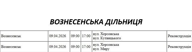 Графік відключення світла по адресах 9 квітня, Вознесенська дільниця АТ «Миколаївобленерго»