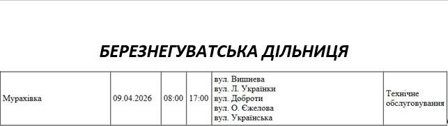 Графік відключення світла по адресах 9 квітня, Березнегуватська дільниця АТ «Миколаївобленерго»