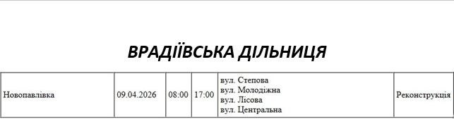 Графік відключення світла по адресах 9 квітня, Врадіївська дільниця АТ «Миколаївобленерго»