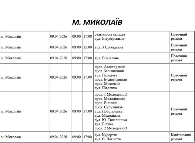 Графік відключення світла по адресах 9 квітня, Миколаївська дільниця АТ «Миколаївобленерго»