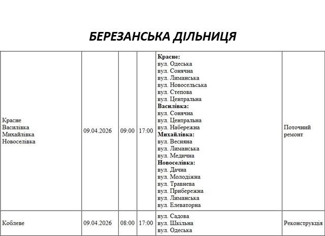 Графік відключення світла по адресах 9 квітня, Березанська дільниця АТ «Миколаївобленерго»