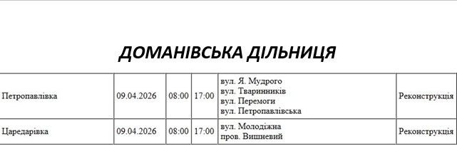 Графік відключення світла по адресах 9 квітня, Доманівська дільниця АТ «Миколаївобленерго»