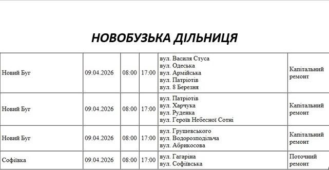 Графік відключення світла по адресах 9 квітня, Новобузька дільниця АТ «Миколаївобленерго»