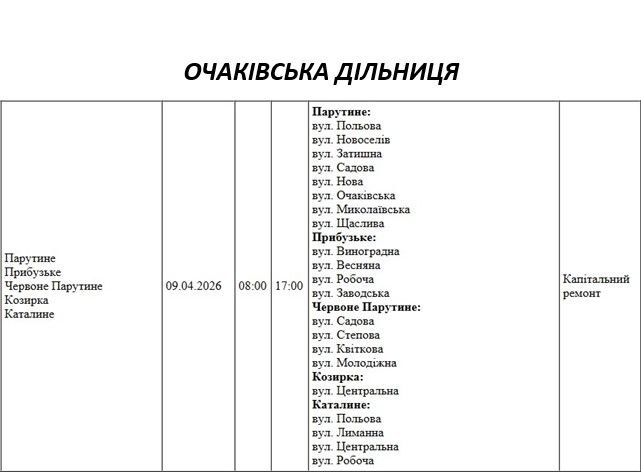 Графік відключення світла по адресах 9 квітня, Очаківська дільниця АТ «Миколаївобленерго»