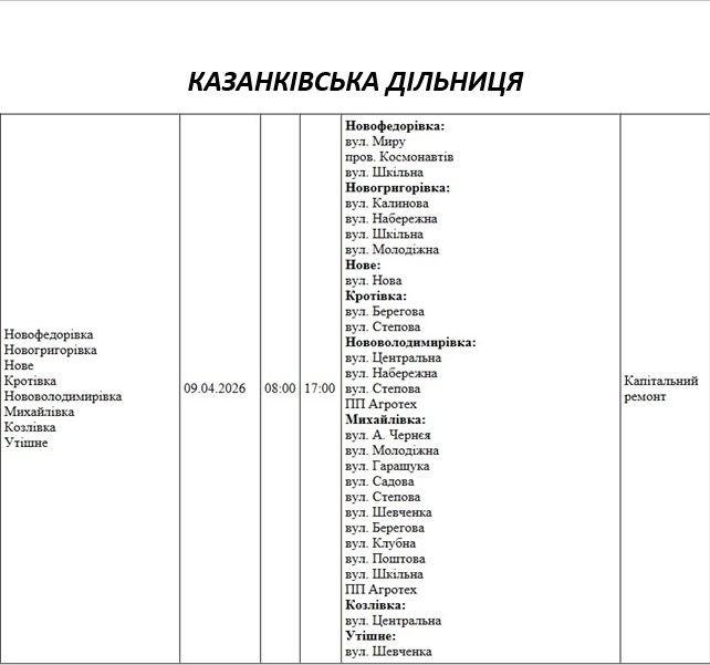 Графік відключення світла по адресах 9 квітня, Казанківська дільниця АТ «Миколаївобленерго»