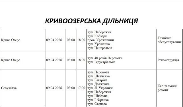 Графік відключення світла по адресах 9 квітня, Кривоозерська дільниця АТ «Миколаївобленерго»