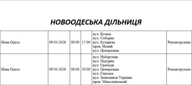 Графік відключення світла по адресах 9 квітня, Новоодеська дільниця АТ «Миколаївобленерго»
