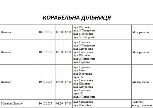 Графік відключення світла по адресах 10 жовтня, Корабельна дільниця. АТ «Миколаївобленерго»