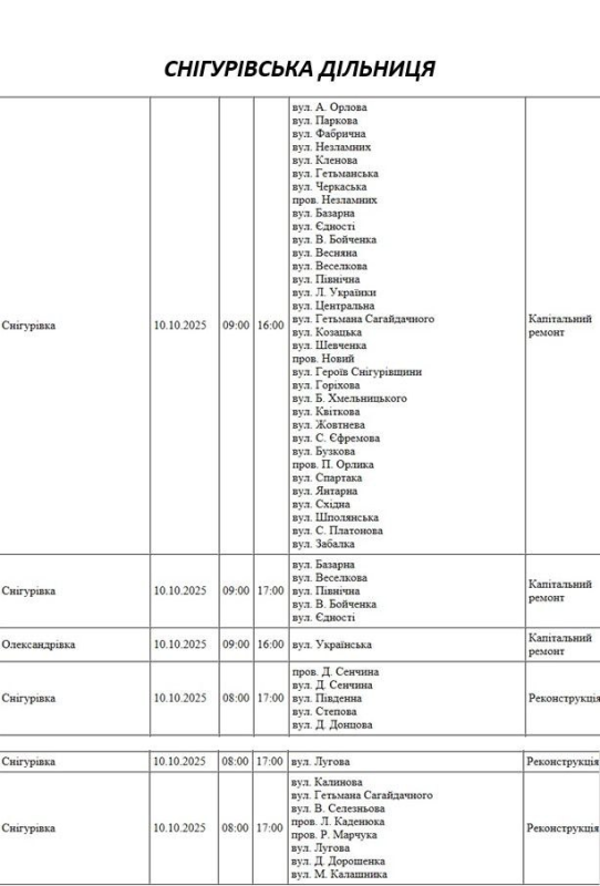 Графік відключення світла по адресах 10 жовтня, Снігурівська дільниця. АТ «Миколаївобленерго»