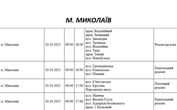 Графік відключення світла по адресах 10 жовтня, Миколаїв. АТ «Миколаївобленерго»