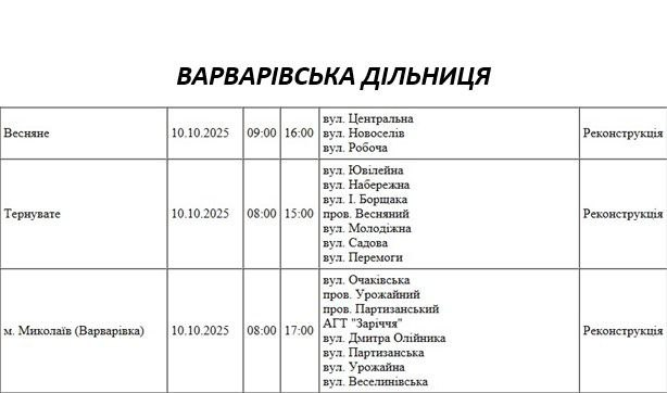Графік відключення світла по адресах 10 жовтня, Варварівська дільниця. АТ «Миколаївобленерго»