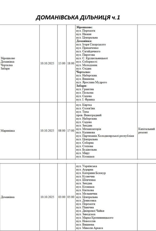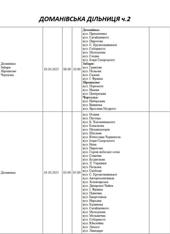 Графік відключення світла по адресах 10 жовтня, Доманівська дільниця. АТ «Миколаївобленерго»