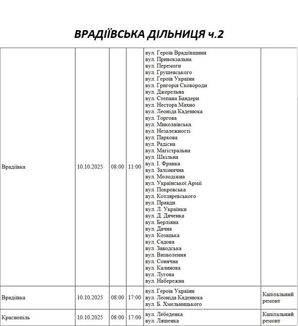 Графік відключення світла по адресах 10 жовтня, Врадіївська дільниця. АТ «Миколаївобленерго»